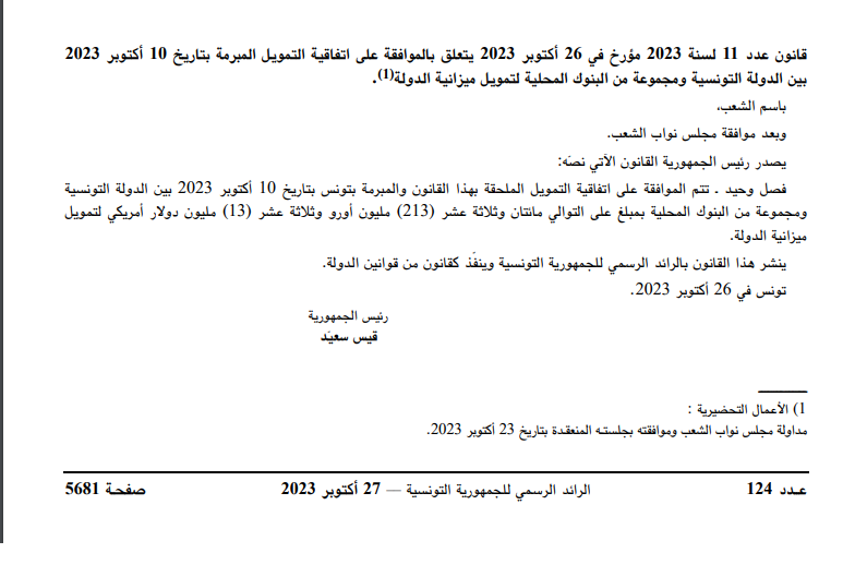 قانون عدد 11 لسنة 2023 مؤرخ في 26 أكتوبر 2023 يتعلق بالموافقة على اتفاقية التمويل المبرمة بتاريخ 10 أكتوبر 2023 بين الدولة التونسية ومجموعة من البنوك المحلية لتمويل ميزانية الدولة.